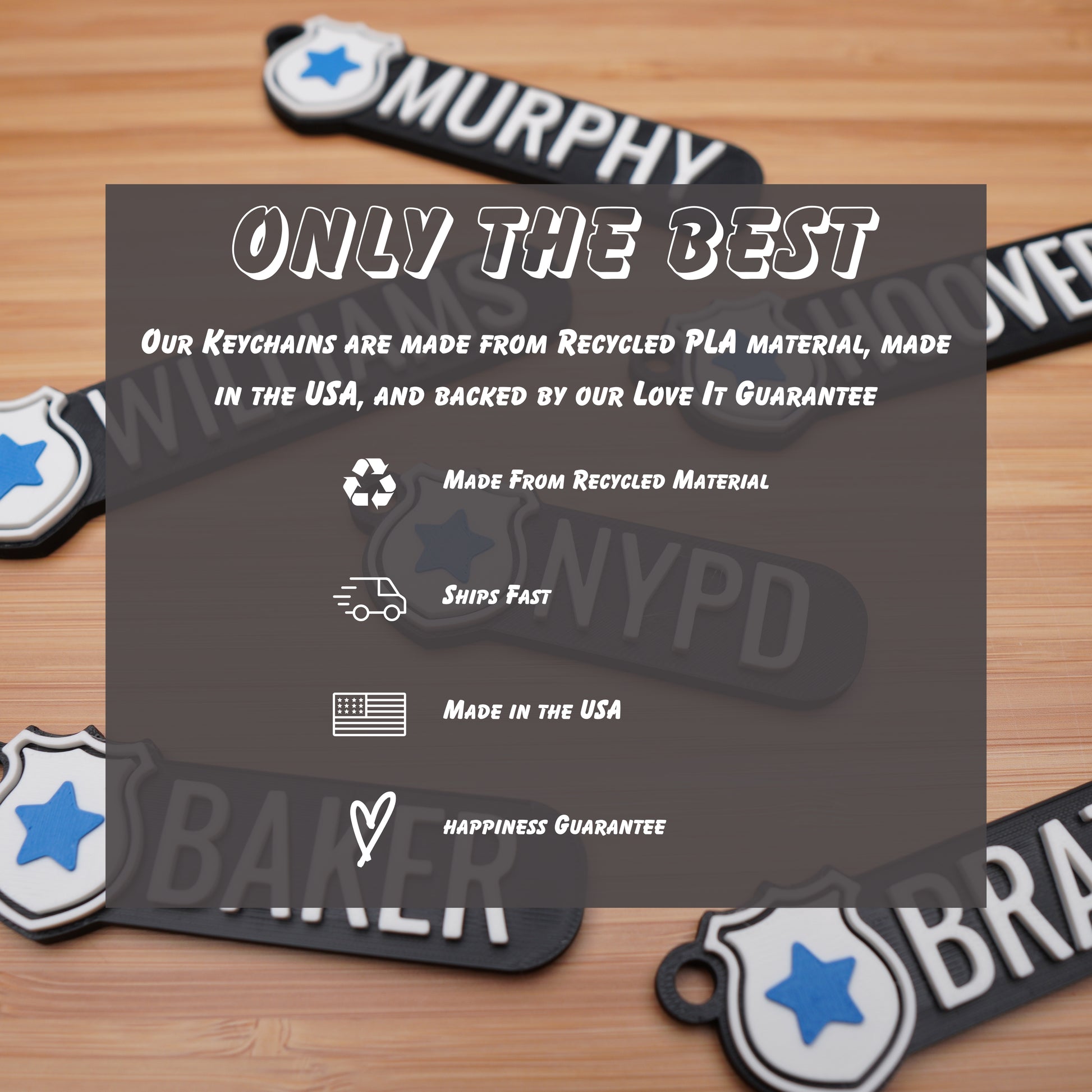 Personalized Police Themed Keychains and Bag Tags. Great for Sports Bags, Backpacks, lunch bags, water bottles, key rings and so much more! It's a perfect gift for the law in enforcement agent in your life.