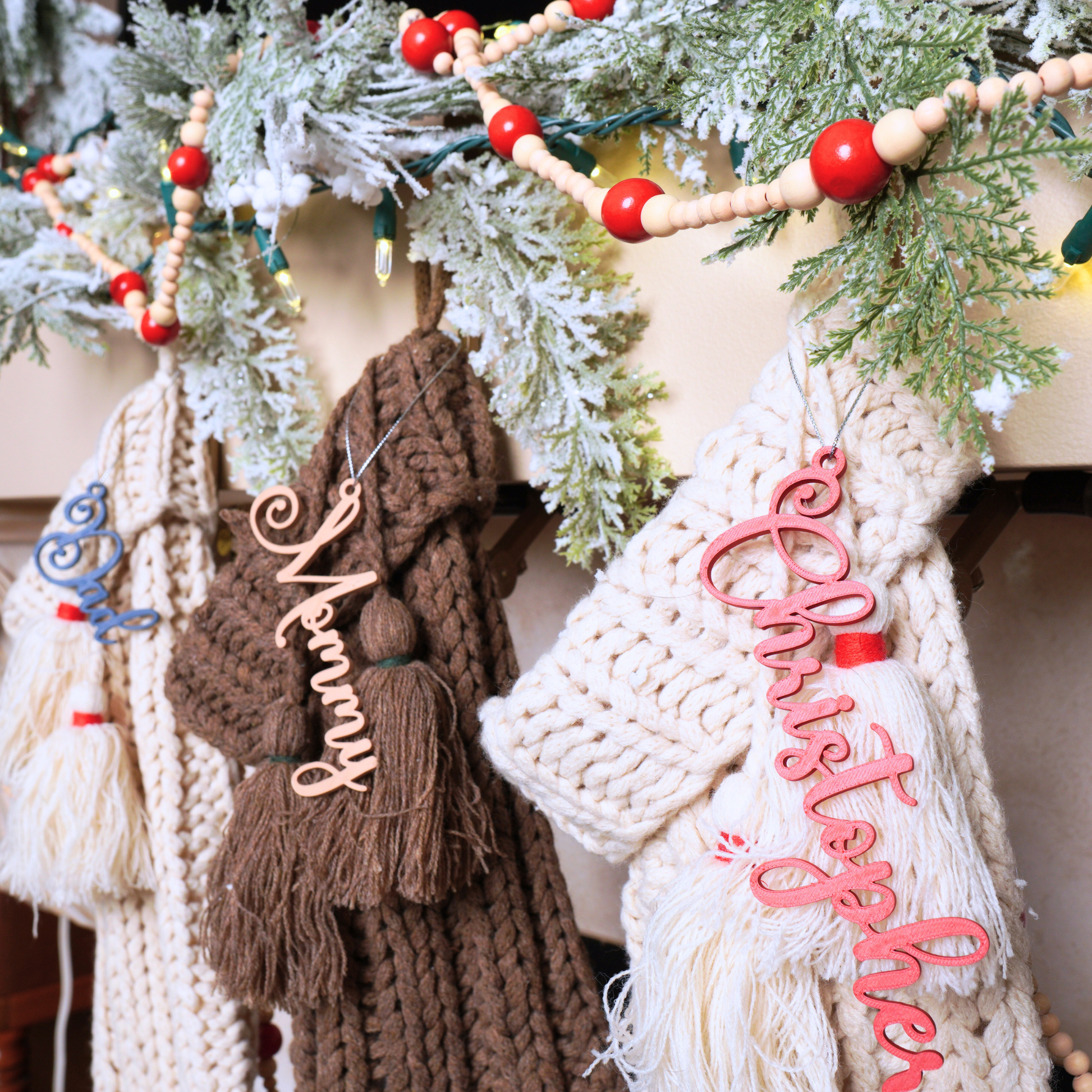 Each name tag is handcrafted and personalized with your custom name, making it a unique and sentimental addition to your mantle. Each stocking tag comes packaged with a silver ornament ribbon included in the bag.